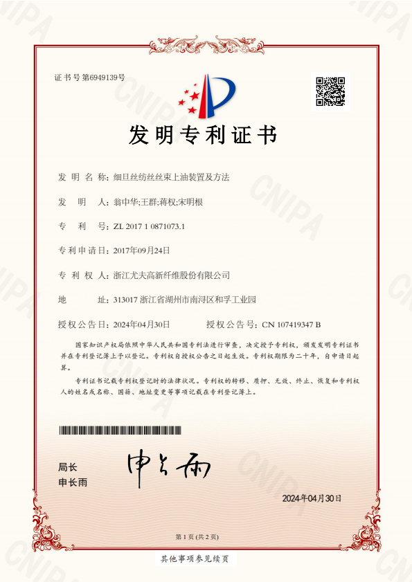 發(fā)明專利證書一種紡絲噴油嘴及其操作方法